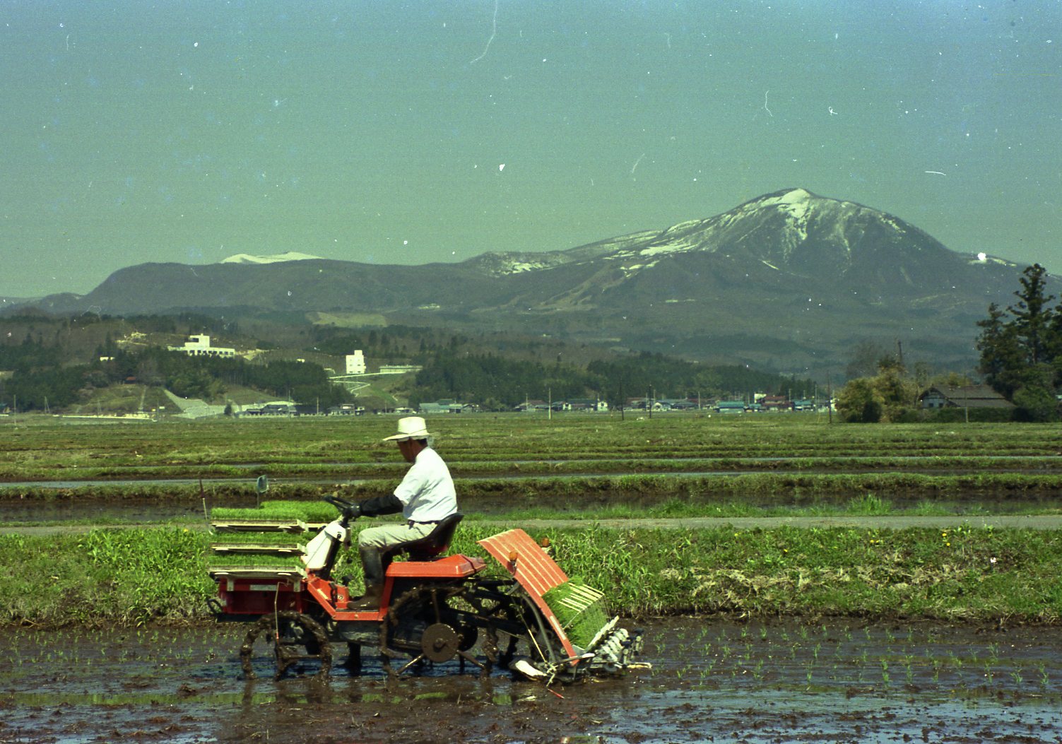 田植え機による田植え作業(昭和59年)。農業機械の普及で少人数での農作業が可能になり、兼業化が進んだ