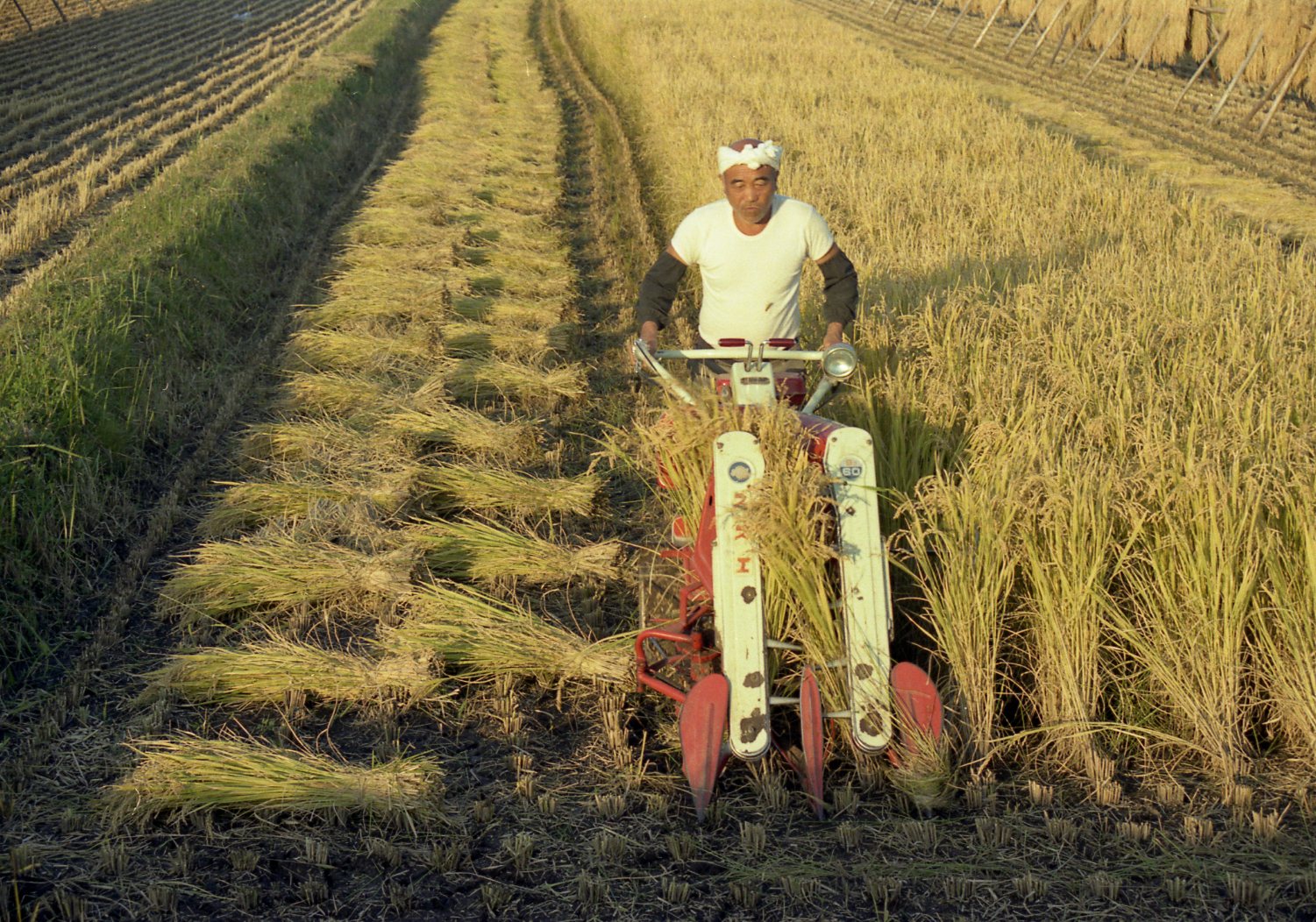 「バインダー」を使った稲刈り(昭和55年)。刈った稲はバインダーによって束ねられ、「はせがけ」で干された
