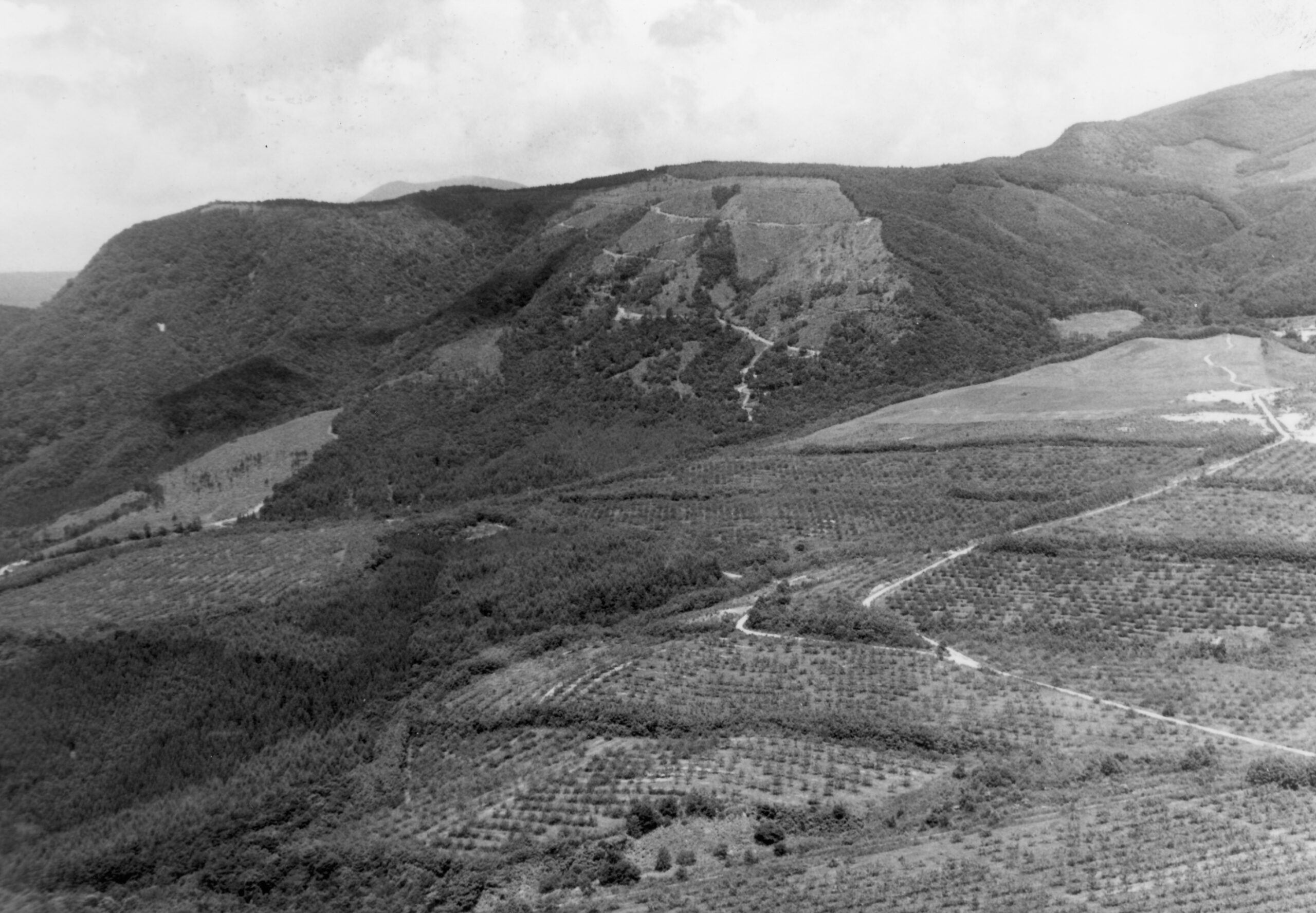 泉ヶ岳・芳の平りんご園(年代不明)。戦後、泉かむりの里ではりんご栽培を始める農家が増えて注目された。芳の平は国指定の開拓パイロット事業の一環として昭和39(1964)年より大規模に行われた