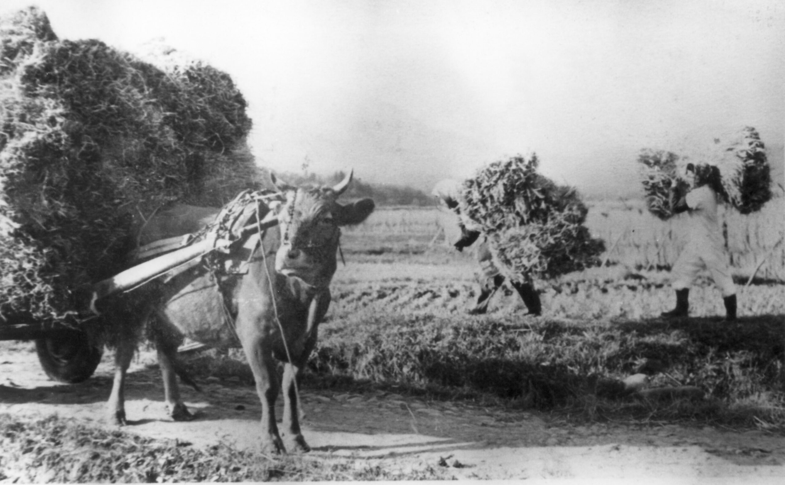 大正時代の稲刈風景。人と家畜の力で農作業がおこなわれていた