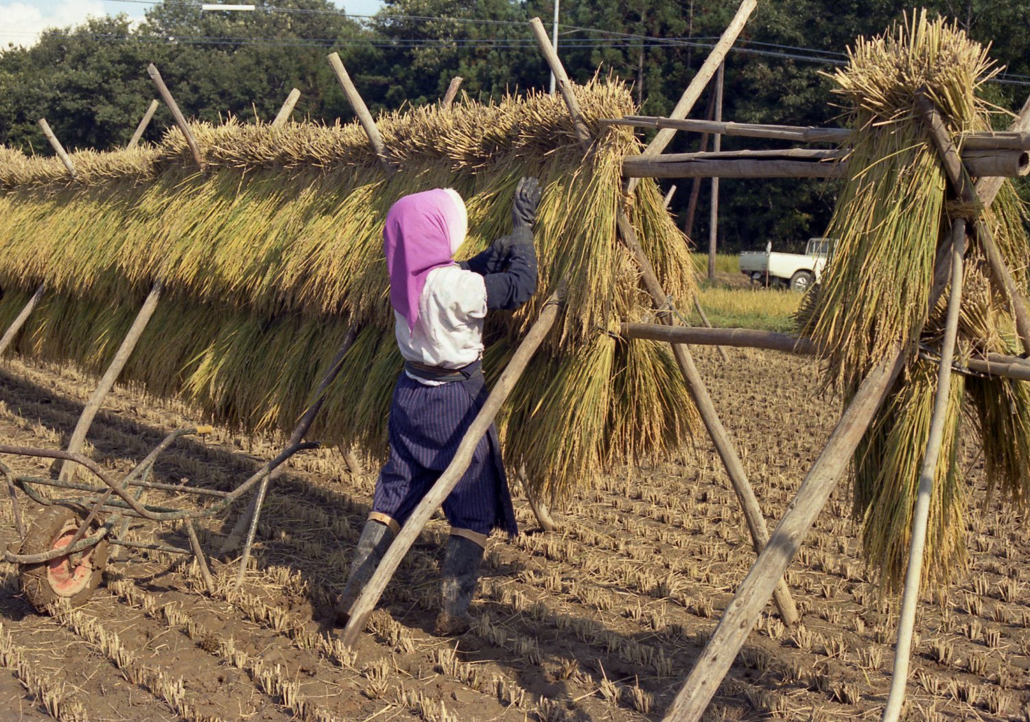 はせがけ(昭和55年)。機械を使わずに稲穂を乾燥させる