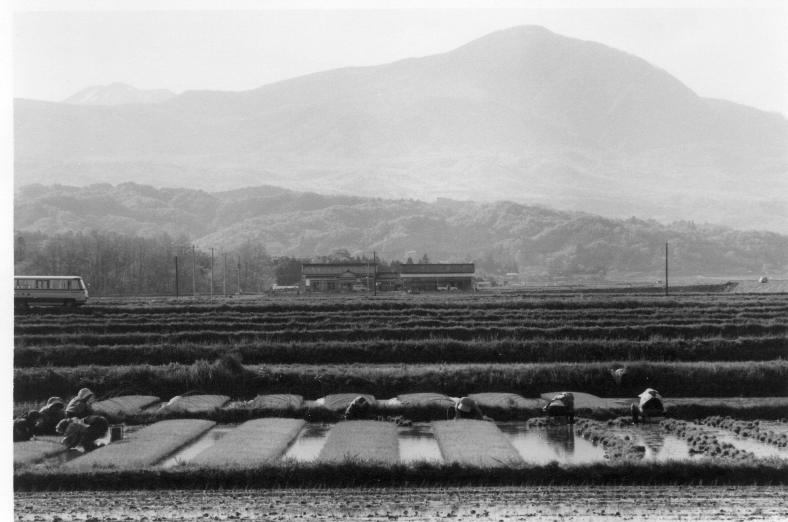 実沢地区基盤整備事業最初の田植え(昭和52年)。段差のある里山の地形では基盤整備が整えられないエリアも多かった