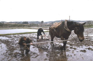 馬によるしろかき(昭和49年)。田植えや直播作業の前に水田に水を入れて土塊を砕き、水平に均一にする作業