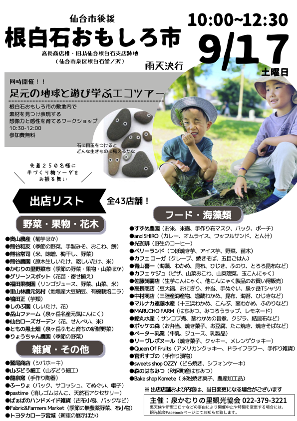 2022年09月15日 9月17日根白石おもしろ市のご案内今週土曜日は根白石おもしろ市です。お天気、良さそう◎・今月も、梅ソーダのお振る舞いを予定しています。・いよいよ秋到来。食べものがますます美味しい季節です。・生産者直売のおもしろ市に秋の味覚を見つけにきてください。・同時開催石や葉っぱなどの自然の素材を使ったエコツアーを予定しています。親子での参加をお待ちしております^^・出店店舗・出店内容の詳細については、チラシデータをご覧ください。